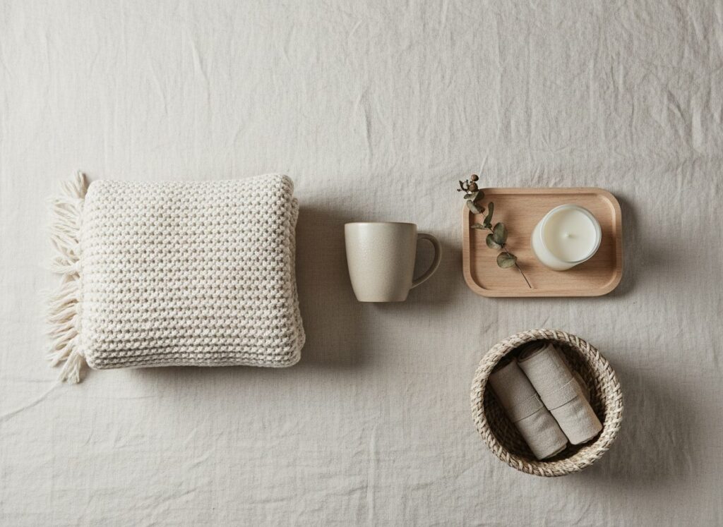 Handpicked items in soothing tones create calm, clutter-free spaces that invite relaxation and balance.